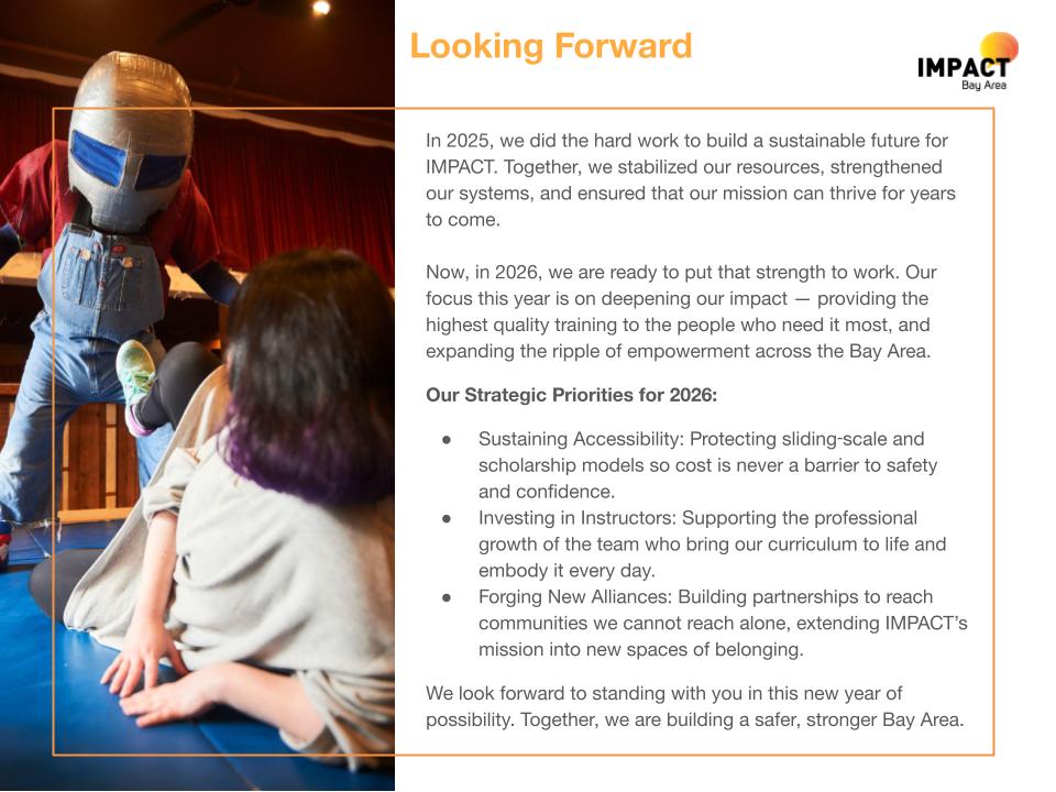 Over the past year, we have faced a season of change, including leadership transitions, limited resources, and rising needs across the Bay Area. At the same time, we have witnessed incredible resilience from our instructors, students, and volunteers. They continue to show up with courage and care. We’ve taught powerful skills, deepened partnerships, and made safety more accessible to hundreds of people.