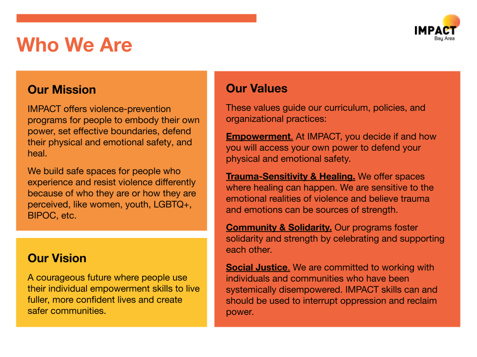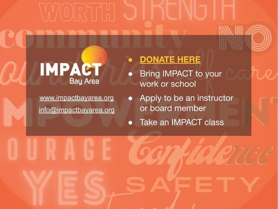 At IMPACT Bay Area, we believe everyone deserves to feel safe, strong, and supported. And we believe safety grows when we build it together.