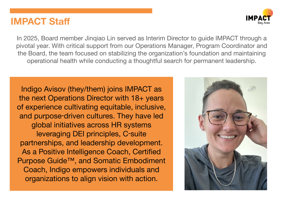 IMPACT Bay Area is a 501(c)3 non-profit (EIN: 94-3123451). Your contribution is tax-deductible. Every online donation will receive an email confirmation for their records